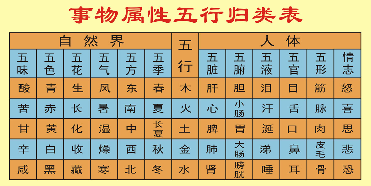 华夏人文初祖伏羲氏发明了易经这套系统,传到黄帝时期已经非常完备,五行学说合理解释了自然宇宙的一系列现象与规律,而华夏先民总结的一大智慧就是“天人合一”思想,已深深根植在文化血脉里。五行学说的应用,最早且得到广泛应用的是中医养生学,其次是后来的命理学(主要是四柱八字)。中医把阴阳五行当做基础,加上元气、脏腑、经络等,就构成了中医养生学的基本理论框架。中医把大自然的五行与其代表的事物和人体脏腑、器官、津液乃至情绪等一一对应起来,利用生克制化的关系进行调整,促使身体各个脏器的功能协调,整体机能趋于平衡,从而达到祛病强身、延年益寿的功效。下图是中医五行的对照表。