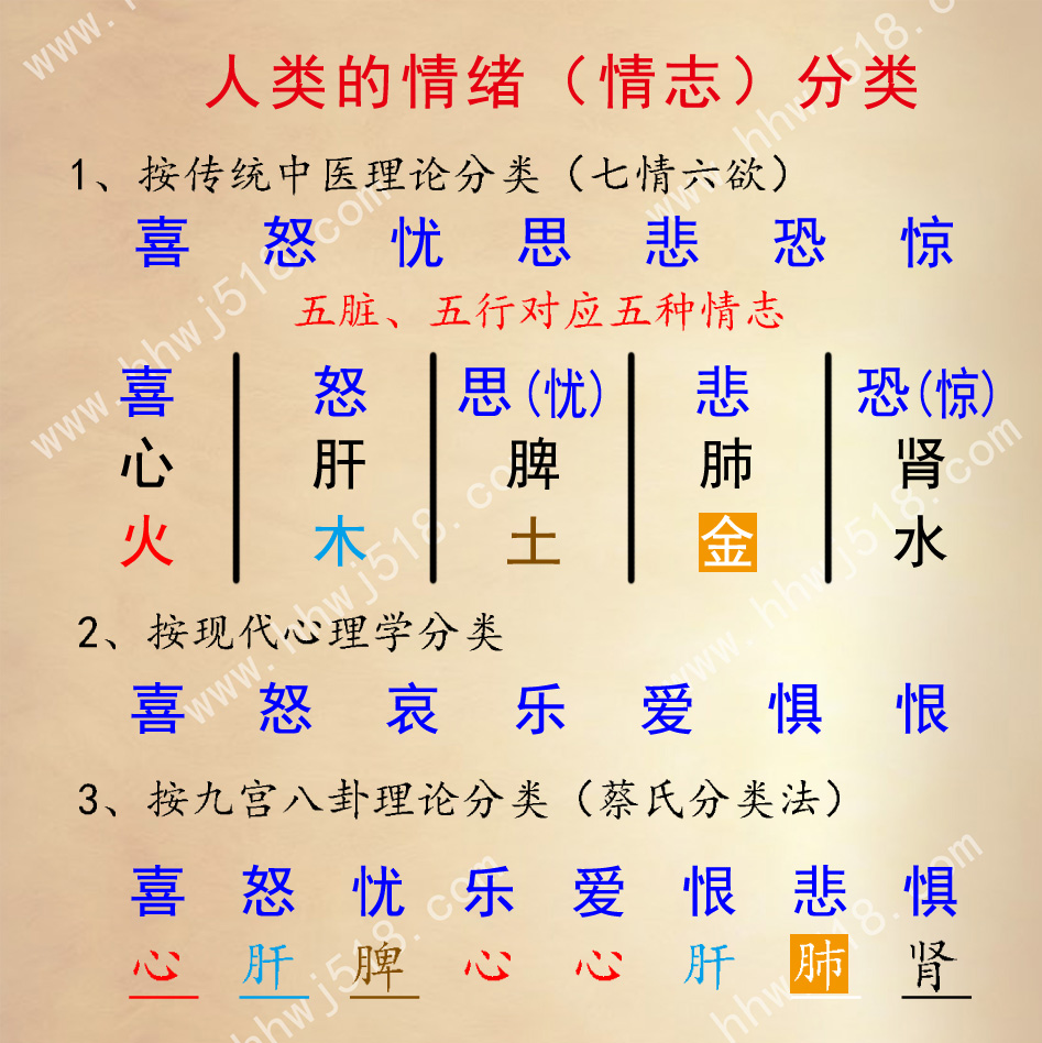 值得一提的是,按照传统的说法,人都有七情六欲,所谓七情就是指喜、怒、忧、思、悲、恐、惊七种情绪。而中医则把人的五脏与五种情志对应起来,即心主喜,肺主悲,肝主怒,肾主恐,脾主思。仔细分析七情发现,可以合并同类项,忧思是同一类,惊恐也是同一类,这样七情实际上只有五情。