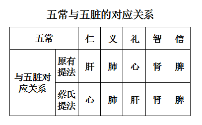 而儒家主张的仁、义、礼、智、信这五种品性,也与五脏存在一一对应关系。不过直到目前为止,一直沿袭着把肝对应仁、心对应礼的说法,应该进行调换一下。基于以下原因,一是五常按仁、义、礼、智、信的顺序,对应人体的五脏就应该是心、肺、肝、肾、脾。中医把心喻为君主之官,肺为宰相之官,肝为将军之官,肾为先天之本,脾为后天之本。儒家以仁爱为核心价值观,主张仁者爱人。仁字的本意就有核心的含义,植物在开发结果之后,把吸收到的天地之精华,蕴藏在一颗核心里面,今天我们吃的瓜子仁,坚果类的果仁,全都是草本或木本植物一生的精华所在。仁字最早的写法是“忈”,代表以天地之心为心。易经这门学说创立后,一直强调天、地、人三才的关系,人居于天地之间,要效法宇宙天地的自然法则即大道。天有天道,地有地道,人道就是法天效地之道,归结为两个字曰“仁义”。所以,我们把心地善良之人称其“宅心仁厚”。按照儒家的观点就是作为君主应该施行仁政而非暴政,统治者树仁德以为榜样,用圣贤教化社会大众,从而倡导修齐平治、礼乐并用,实现以德治国、秩序井然、国泰民安。义者宜也,有适宜、发散、分享等多个含义。做恰当的事情,把自己的资财散发给他人、无偿地帮助他人,都叫做义行或义举,五脏中肺对应五常的义。我们平常骂一个人没心没肺,实际上就是说他是个不仁不义之徒。