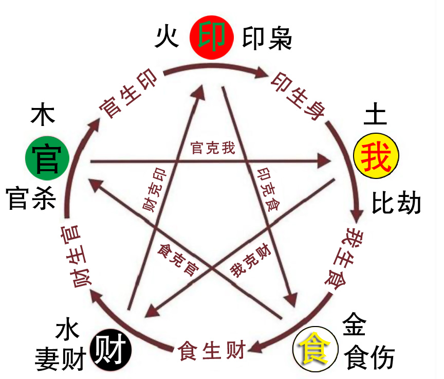 在十神的生克制化关系中,比劫生食伤,食伤生财,财生官,官生印,印生比劫。比劫克财,财克印,印克食伤,食伤克官,官克比劫。(参见己土日元十神生克对照表)